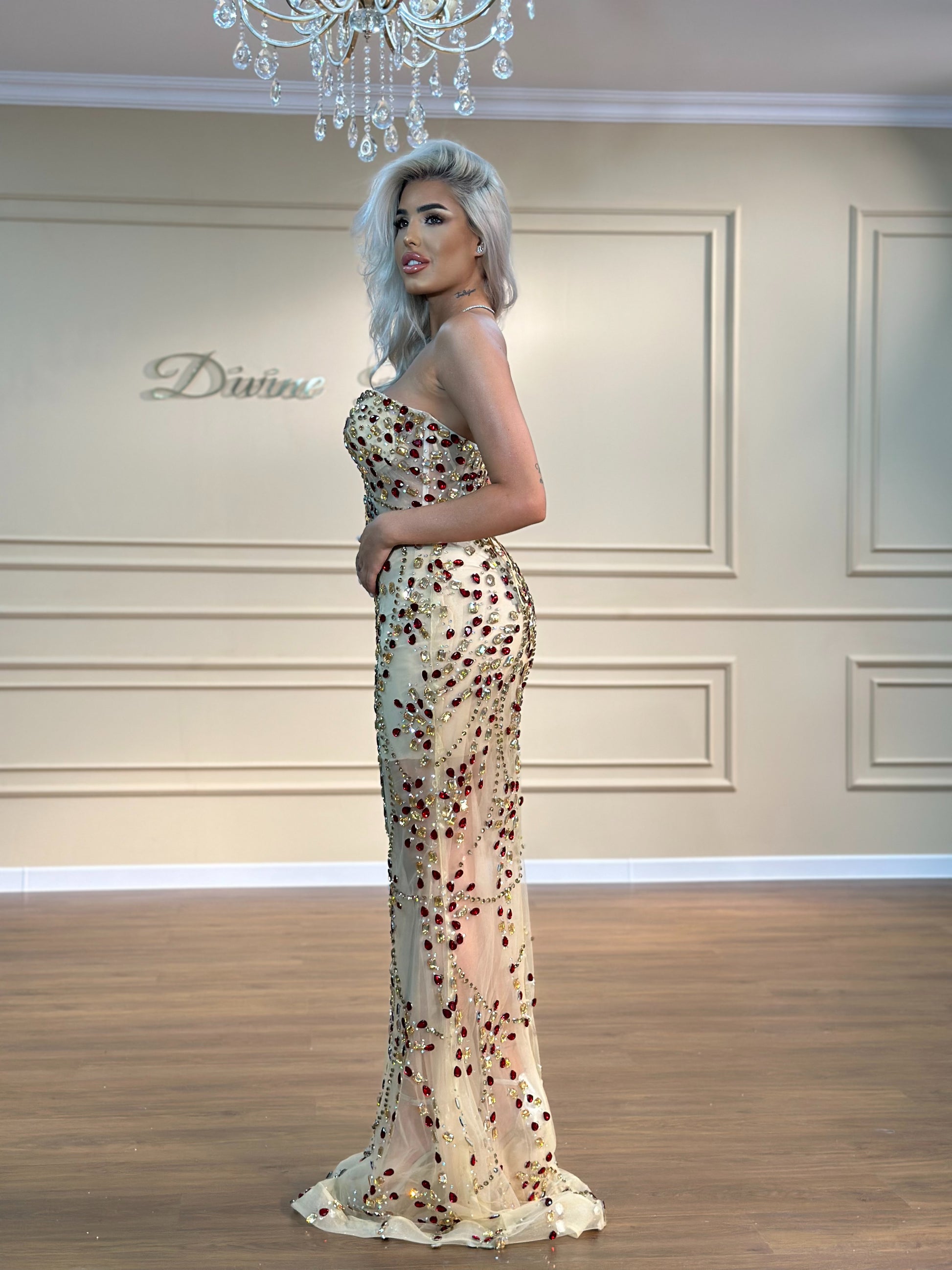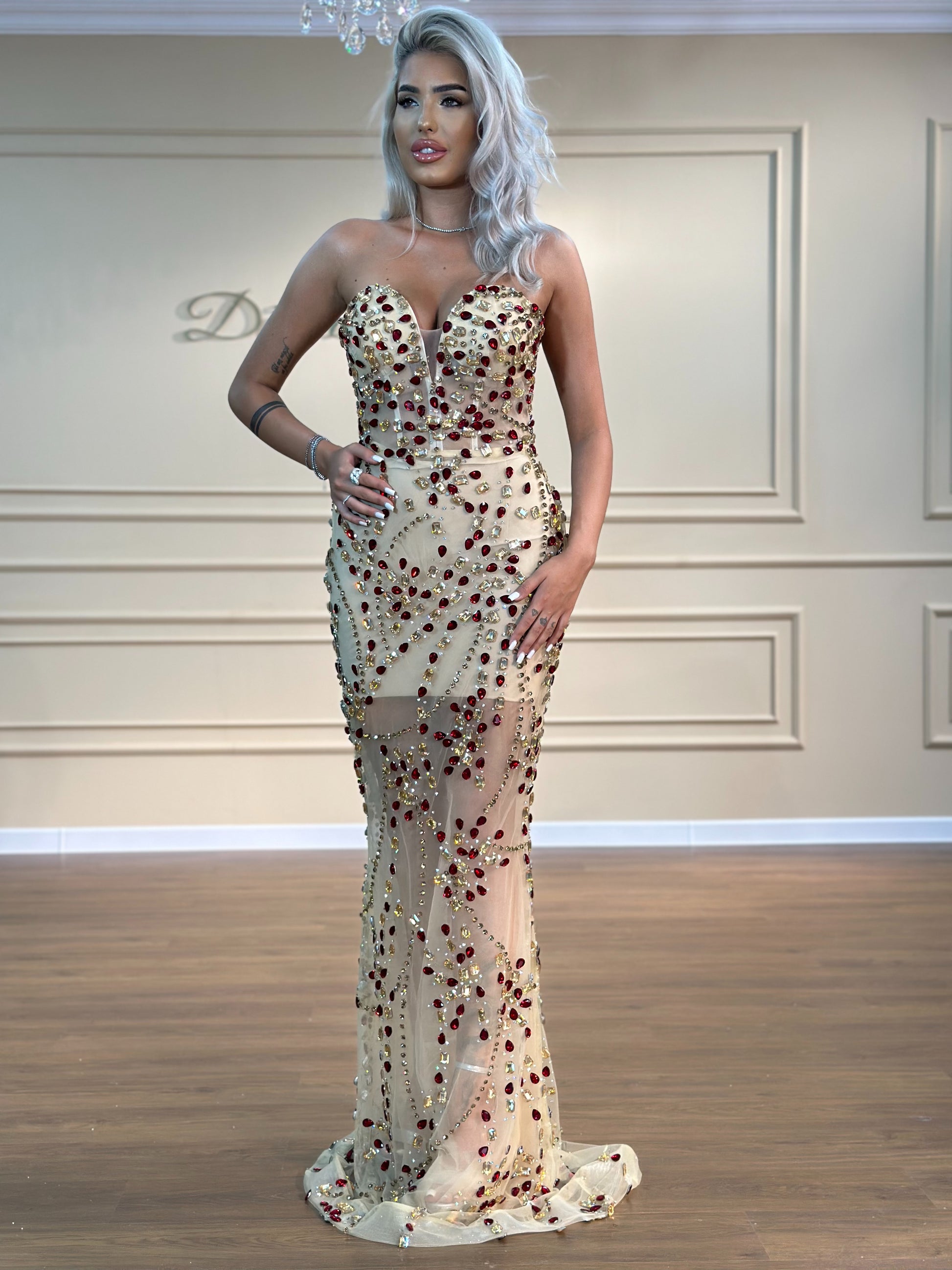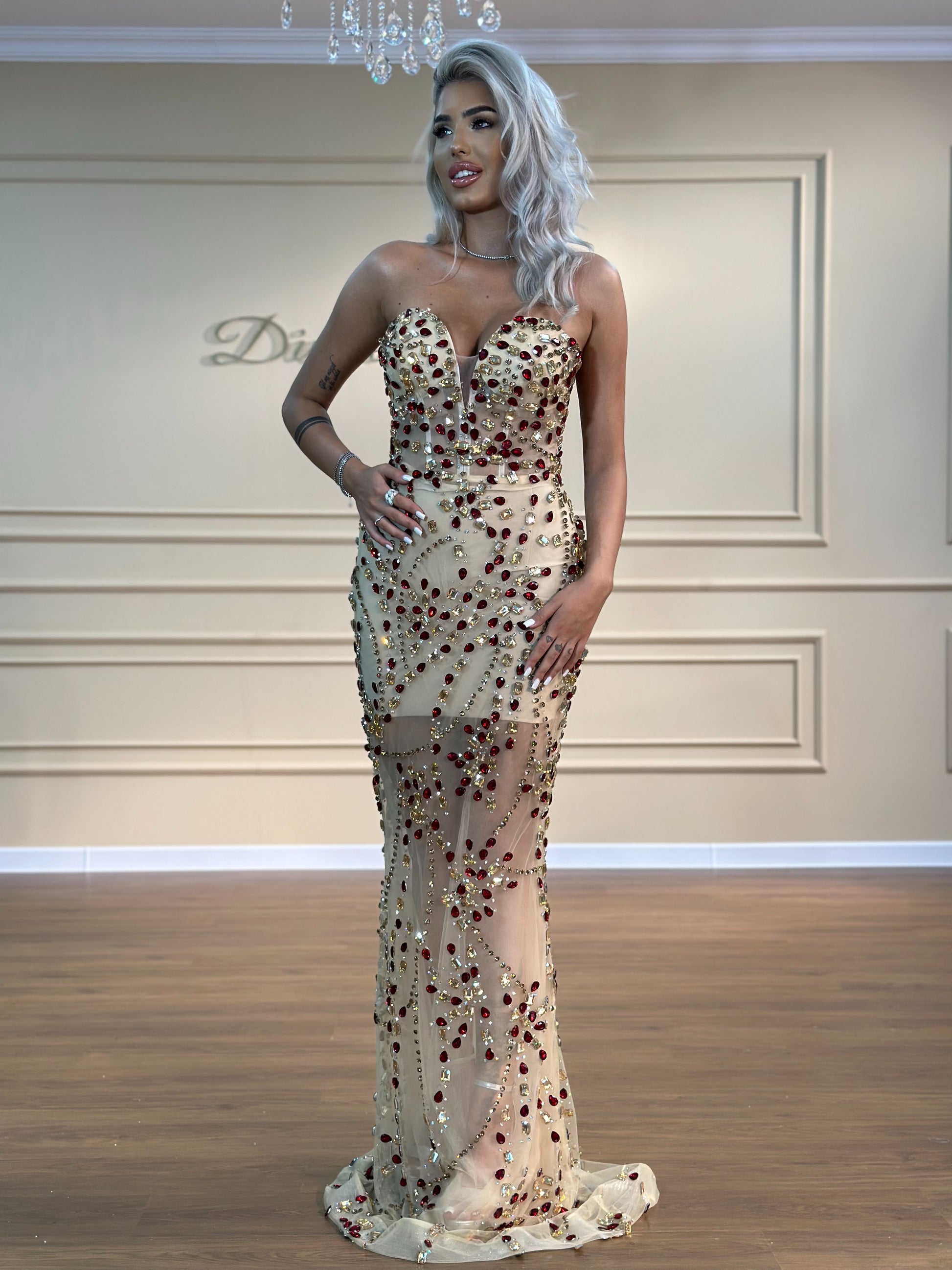 Rochia urmărește linia corpului, cu un corset bine structurat și aplicații strălucitoare care evidențiază bustul și talia. Decolteul adânc în formă de inimă adaugă un plus de senzualitate și rafinament, iar croiala lungă, cu trenă delicată, oferă o prezență impunătoare.