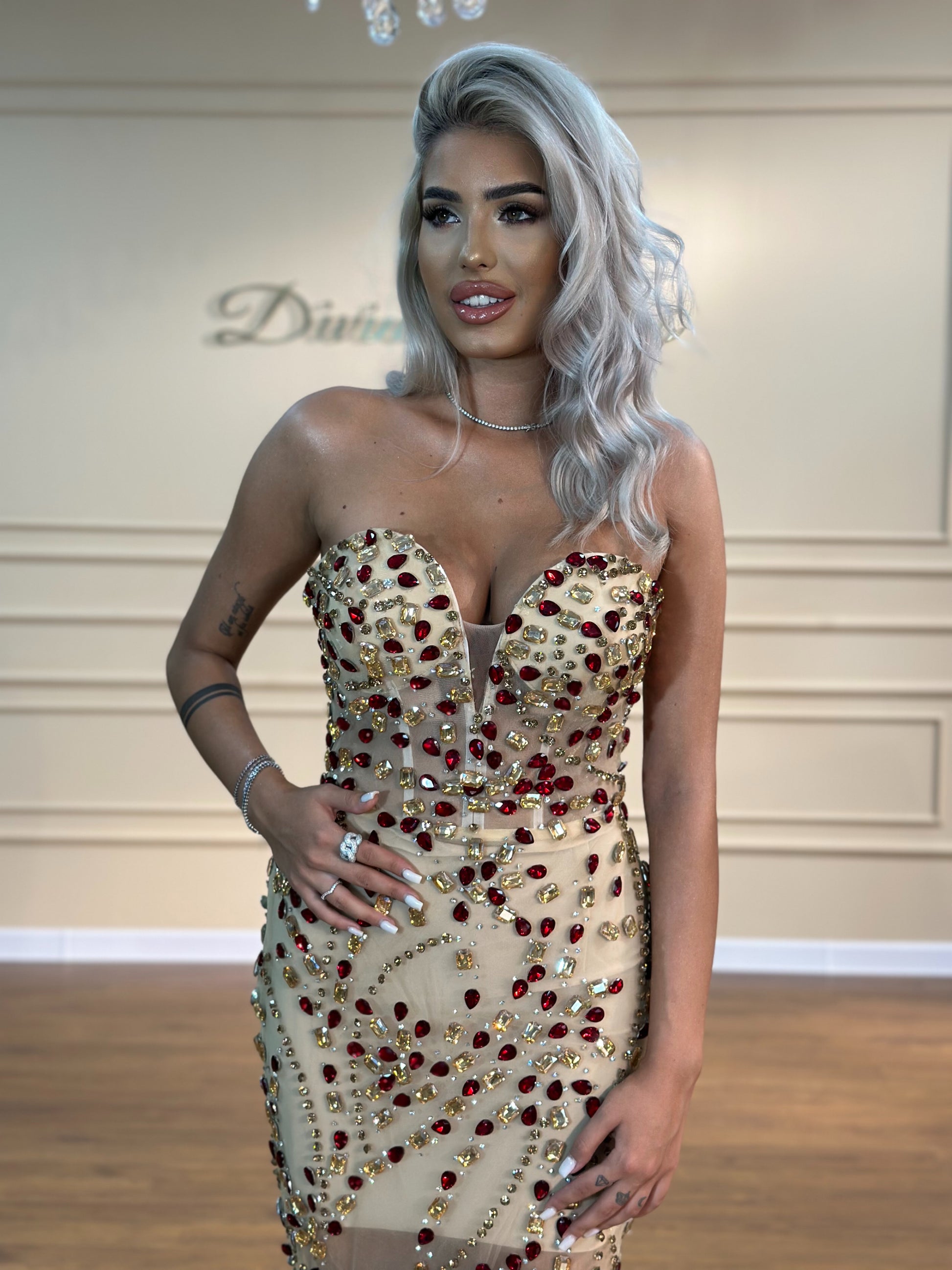 Aplicațiile roșii regale sunt distribuite pe întreaga rochie, creând un efect vizual impresionant și captivant. Fusta transparentă în partea inferioară adaugă un element de mister și senzualitate, oferind un look sofisticat și modern.
