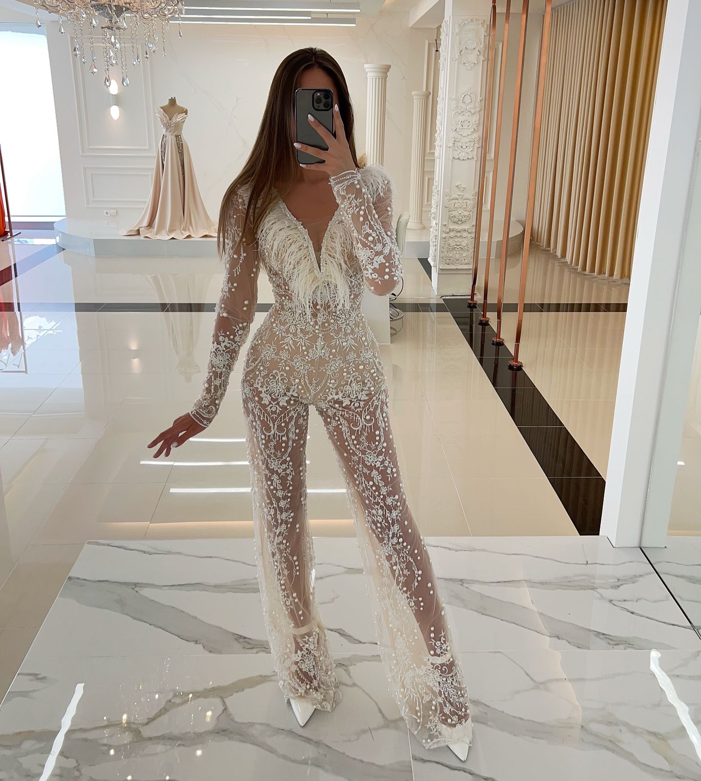 Detaliile de broderie manuală, perlele delicate și penele fine de pe corset creează o alură regală. Materialul semi-transparent adaugă un aer seducător și sofisticat, perfect pentru o mireasă modernă.