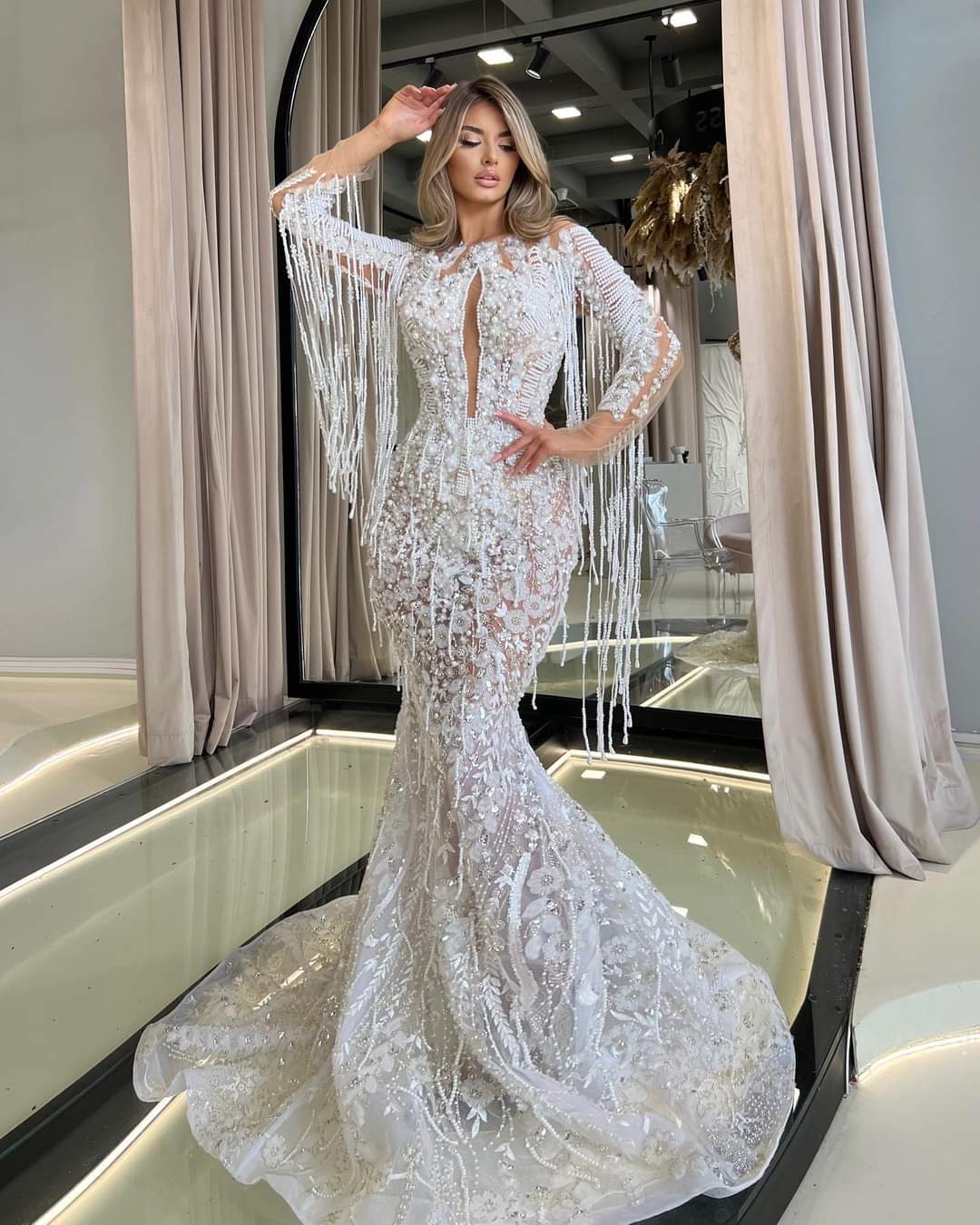 Completează look-ul cu un machiaj natural, cercei eleganți și o coafură sofisticată. Adaugă un voal lung pentru un efect regal și un look de neuitat.