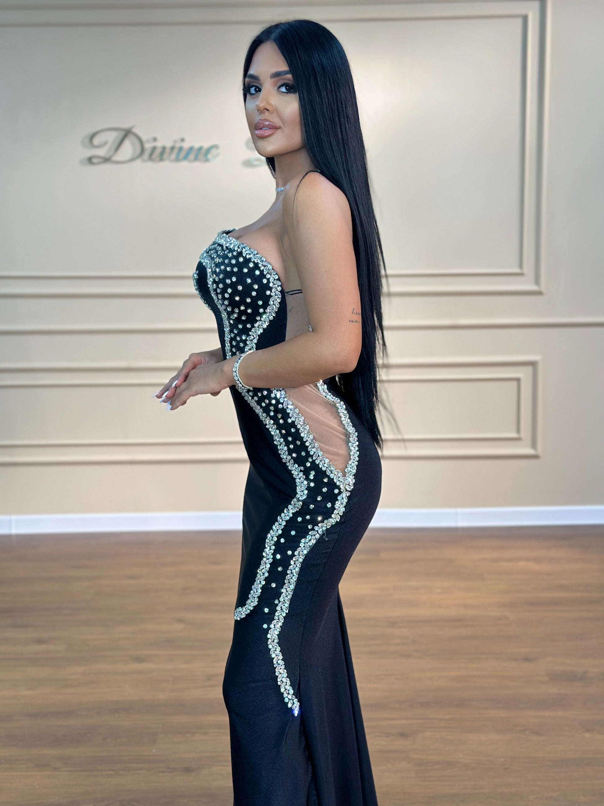 Cu o croială mulată ce îți pune în valoare silueta, această rochie îți oferă un look senzual și elegant. Decolteul fără bretele este perfect pentru a-ți scoate în evidență umerii, în timp ce aplicațiile de cristale formează un efect spectaculos de-a lungul bustului și taliei.
